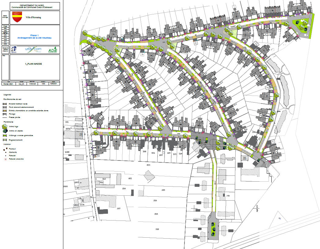 Création d’entrée charretière en enrobés colorés clairs, placettes en pavages, stationnement en pavés drainants et de zones de plantations d’espaces verts